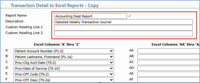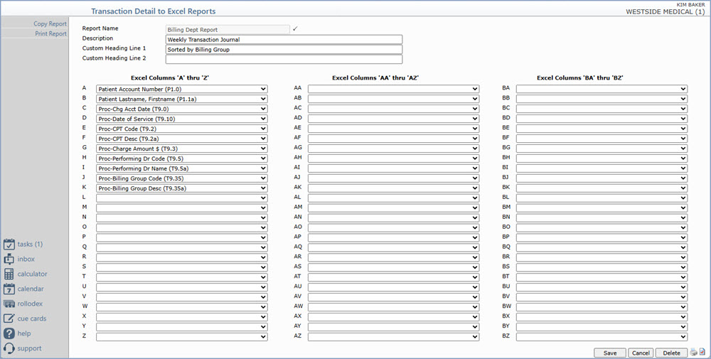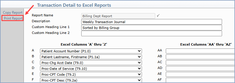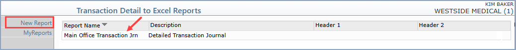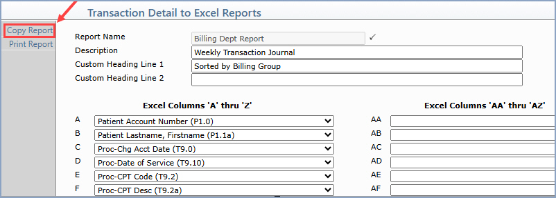 Upon accessing the function, any previously saved report definitions will be listed. You can select an existing report to Print or Copy it by clicking anywhere in the row or you can click the New Report Action Column button to create a new report.
