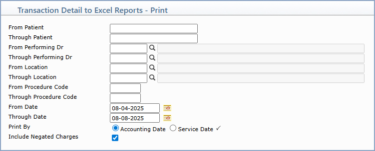 | Include Negated Charges | If you want the report to include negated charges, select this check box. | 1 |